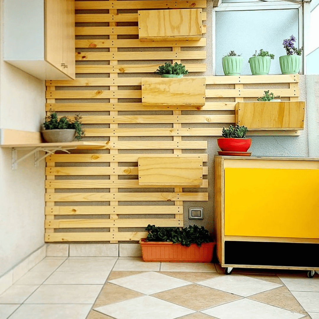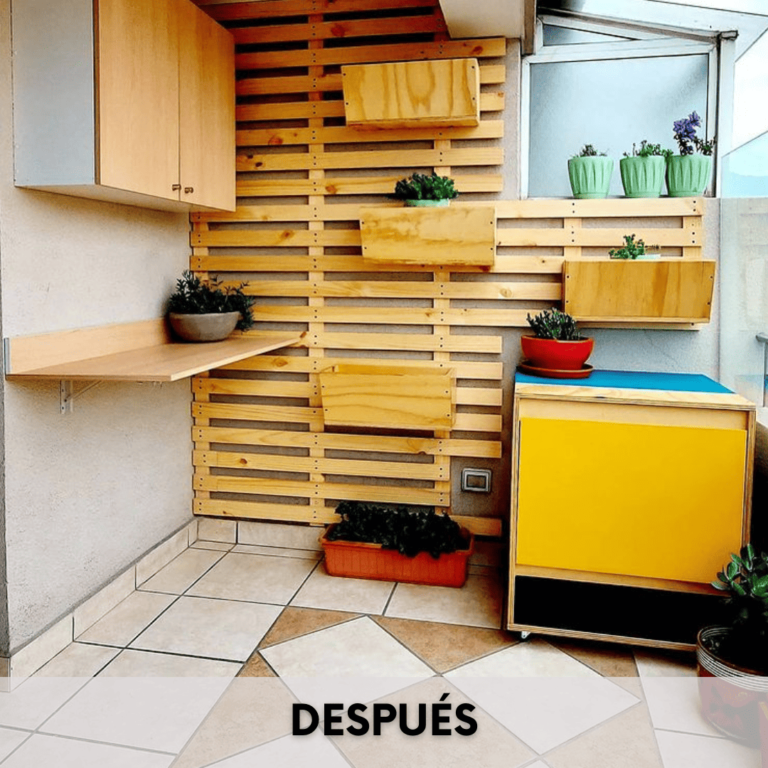 Para mejorar la ambientación, creamos un jardín vertical con un triage de madera y macetas, aportando un toque natural y acogedor al espacio. Este proyecto refleja nuestra capacidad para transformar áreas reducidas en ambientes funcionales y atractivos.