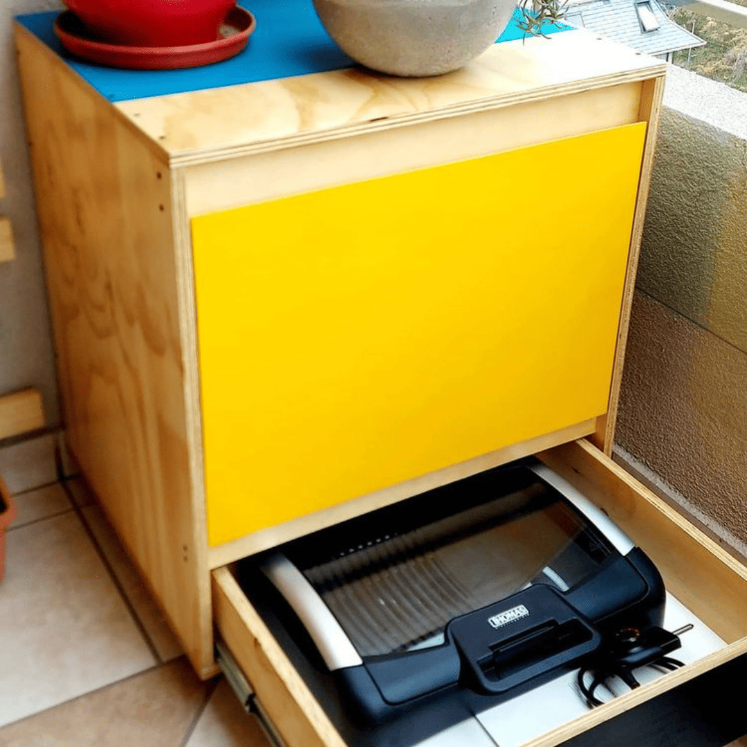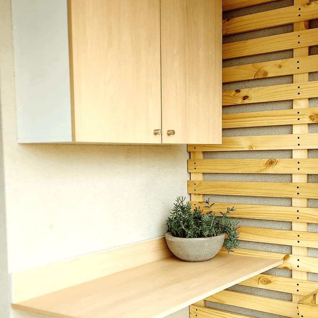Diseñamos un mueble de colgar a medida y una mesa plegable innovadora, optimizando el espacio para disfrutar de asados al aire libre y almacenar vajilla. Incorporamos un mueble adicional para artículos de jardinería y la parrilla eléctrica.